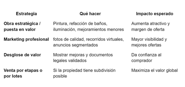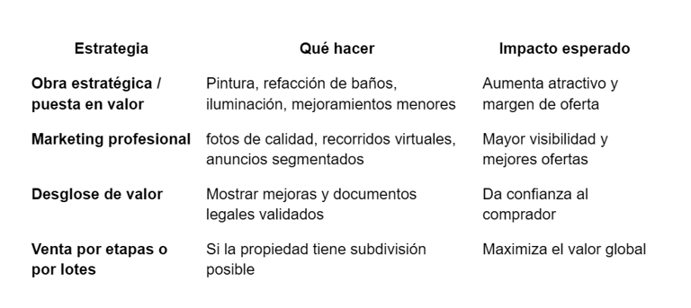 Sumar valor tasado + costos legales pendientes (impuestos, escrituración, cargas) para obtener precio “limpio” para herederos.